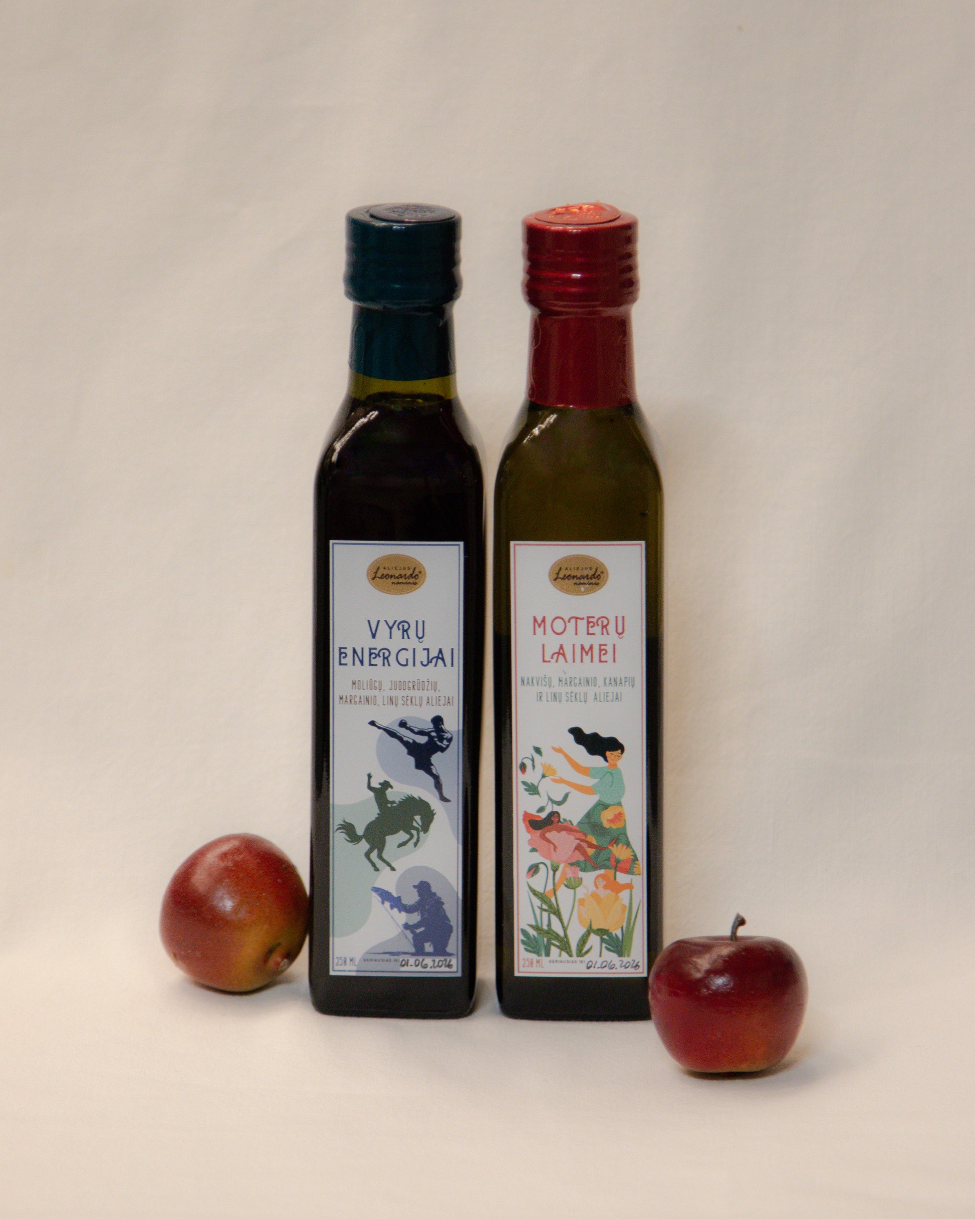 Rinkinį sudaro: aliejų mišinys “Moterų laimei” (sudėtis: nakvišų sėklų aliejus 25%, margainio sėklų aliejus 25%, kanapių sėklų aliejus 25%, linų sėmenų aliejus 25%) ir aliejų mišinys “Vyrų energijai” (sudėtis: juodgrūdžių sėklų aliejus 25%, moliūgų sėklų aliejus 25%, margainio sėklų aliejus 25%).